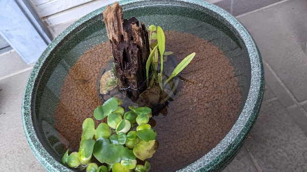憧れの陶器の睡蓮鉢を用いたビオトープが完成しました。