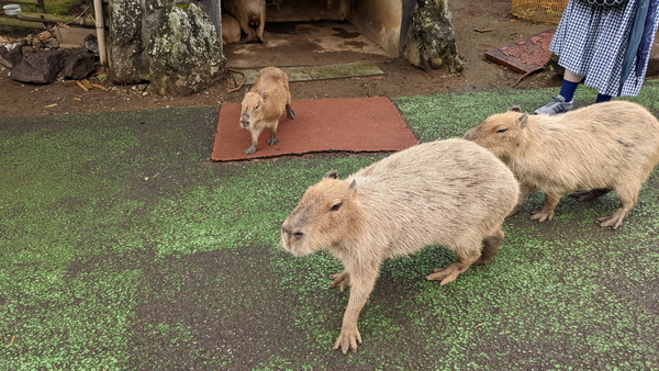 雨上がりであったためベンチがびしょ濡れだったので、ベンチにお尻を付けることができず空気イスで頑張る父と娘、そしてカピバラさんとの貴重な3ショット写真を撮ることができました。この写真がこの旅一番のお気に入りです。