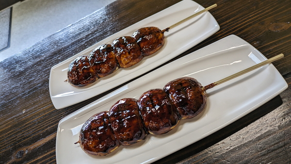 帰りに駐車場のあるお土産屋さんで一串250円の焼きまんじゅうを二串頂く。お支払いは先程のお買い物券で。それにしても一串がこれほどデカいとは思わなかった。