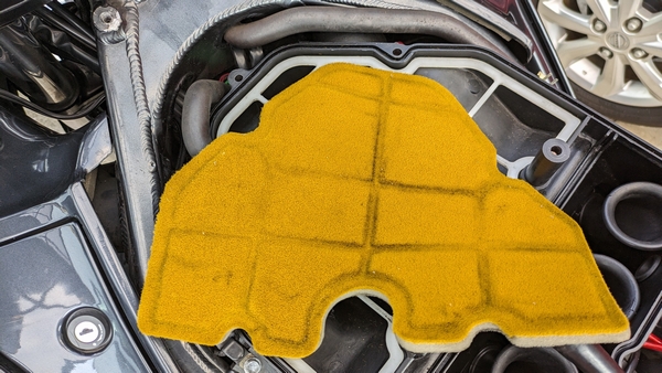 続いてエアフィルター。あまり汚れていないけどオイルを染み込ませていないので、洗浄して乾燥させてからオイル漬けにしようとも思ったけど、面倒だったので新品買っちゃった。社外品で1000円だったし。